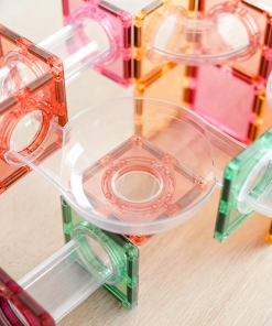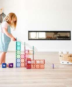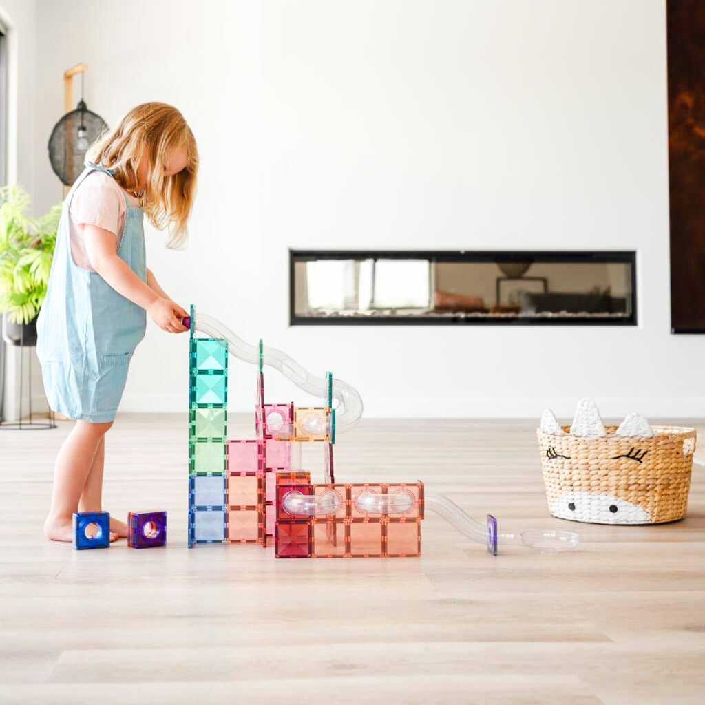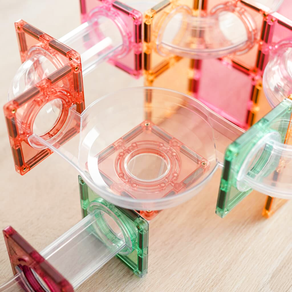 This open-ended expansion pack includes connector square magnetic tiles, wooden balls plus a range of clear, fluted tubes to allow you to explore motion and gravity like never before – an X-shape to re-direct and pivot the action, double-entry bowls for new ways to collaboratively play and race, spiral pieces for eye tracking fun, plus 1/2 and 1/4 pieces for twists and turns.