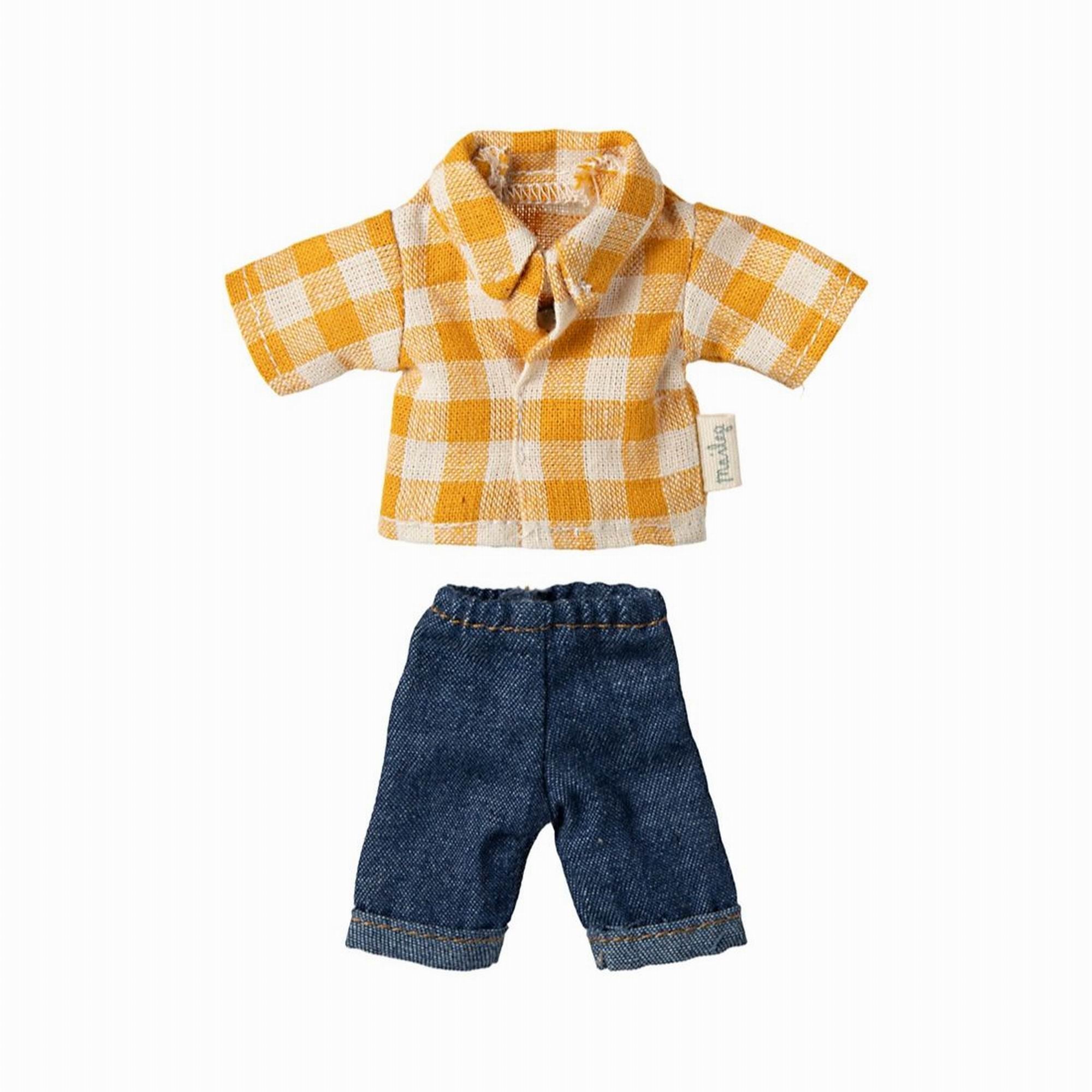 A classic Maileg item; Dad mouse in checked shirt and denim pants. This mouse fits furniture and accessories in size mouse. Buy more clothes separately. Clothes in size mum/dad fits this mouse.